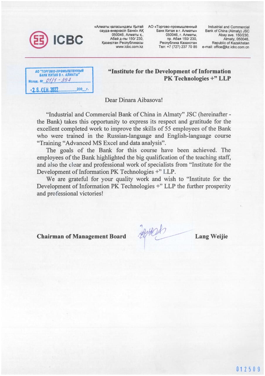 Отзыв о углубленном курсе MS EXCEL от банка АО "Altyn Bank"